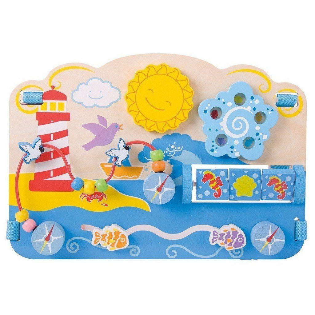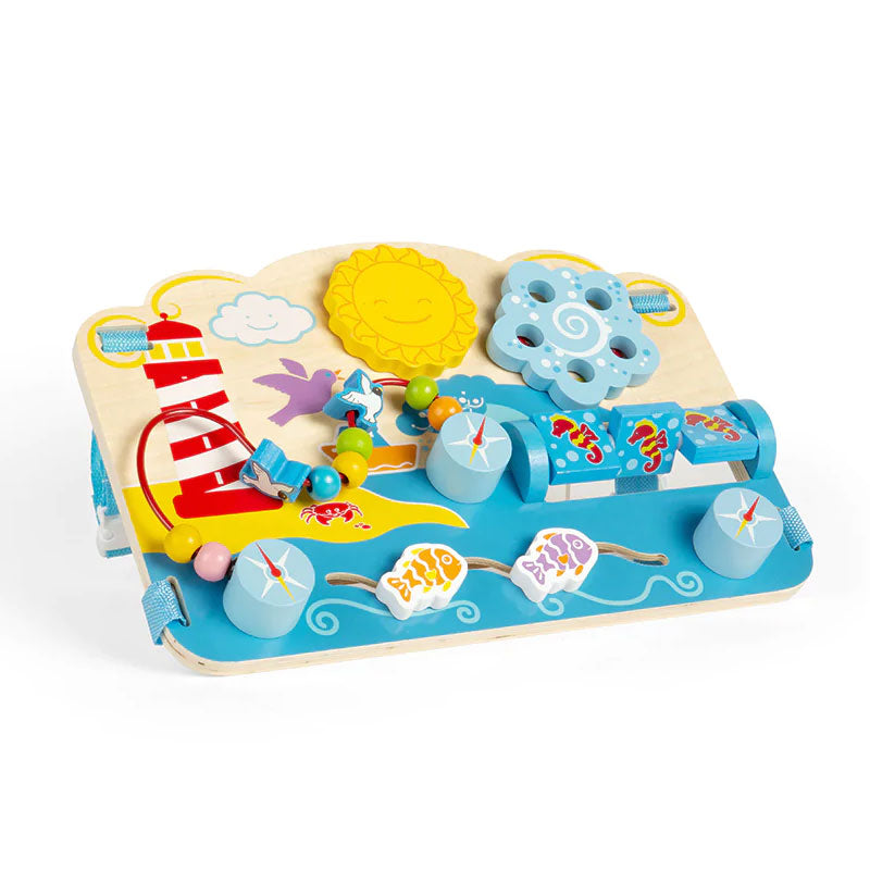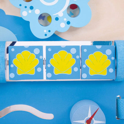 There’s so much to discover: a spinning sun, a friendly flower, and three colourful blocks to match, featuring seahorses and shells. Little hands can also help the birds glide along the beaded wire or guide the fish through the water – all great for building fine motor skills and early coordination.