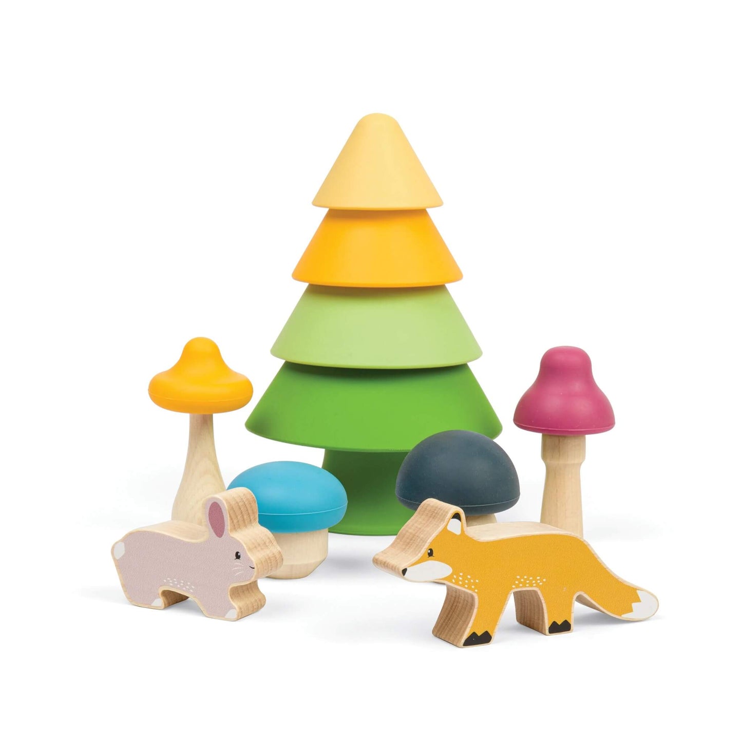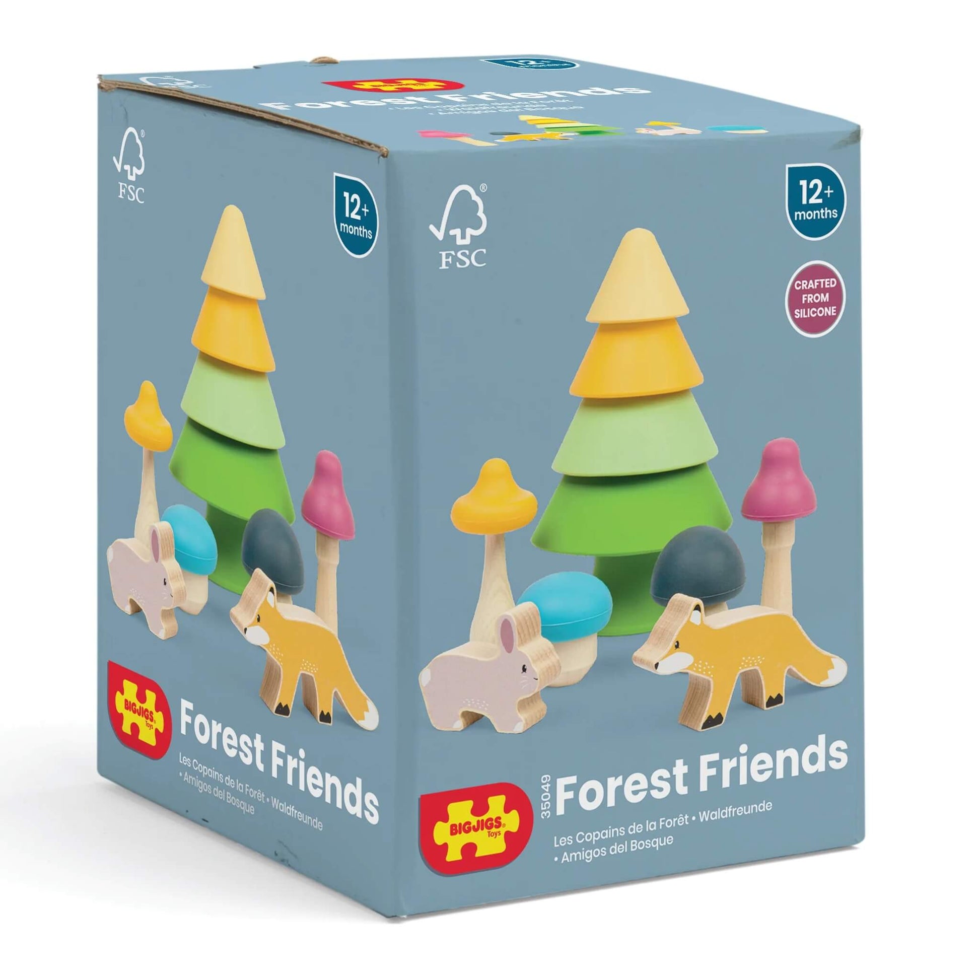 The Bigjigs Toys Forest Friends Playset is perfect for creating enchanting woodland scenes. This charming set includes four wooden mushrooms, a colourful stacking tree, and two adorable forest animals – a playful fox and a curious bunny – all made from sustainable silicone and FSC® certified wood.
