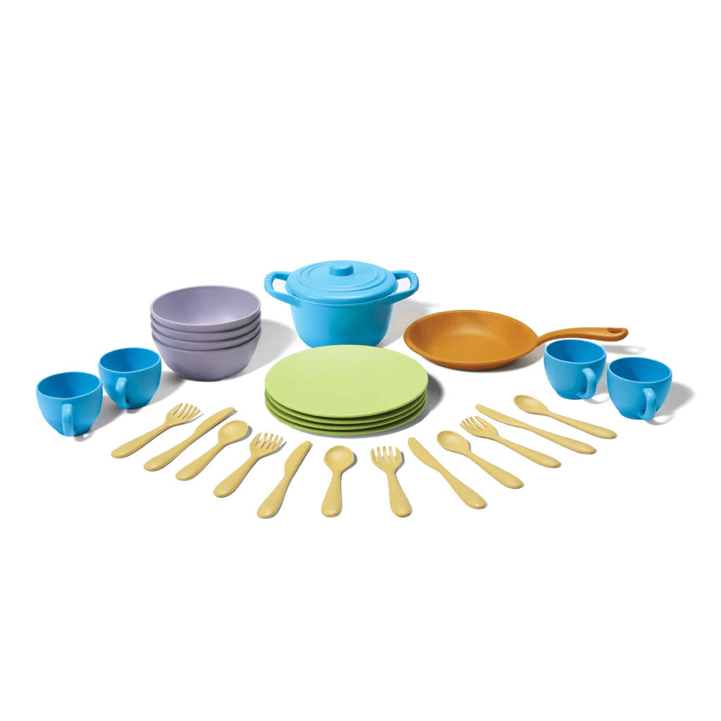 The Green Toys Cookware & Dining Set is a fantastic way to inspire pretend play and mealtime imagination. With a stockpot, skillet, four place settings and utensils, it’s just the thing for hosting teddies, dolls, and family dinner guests alike.