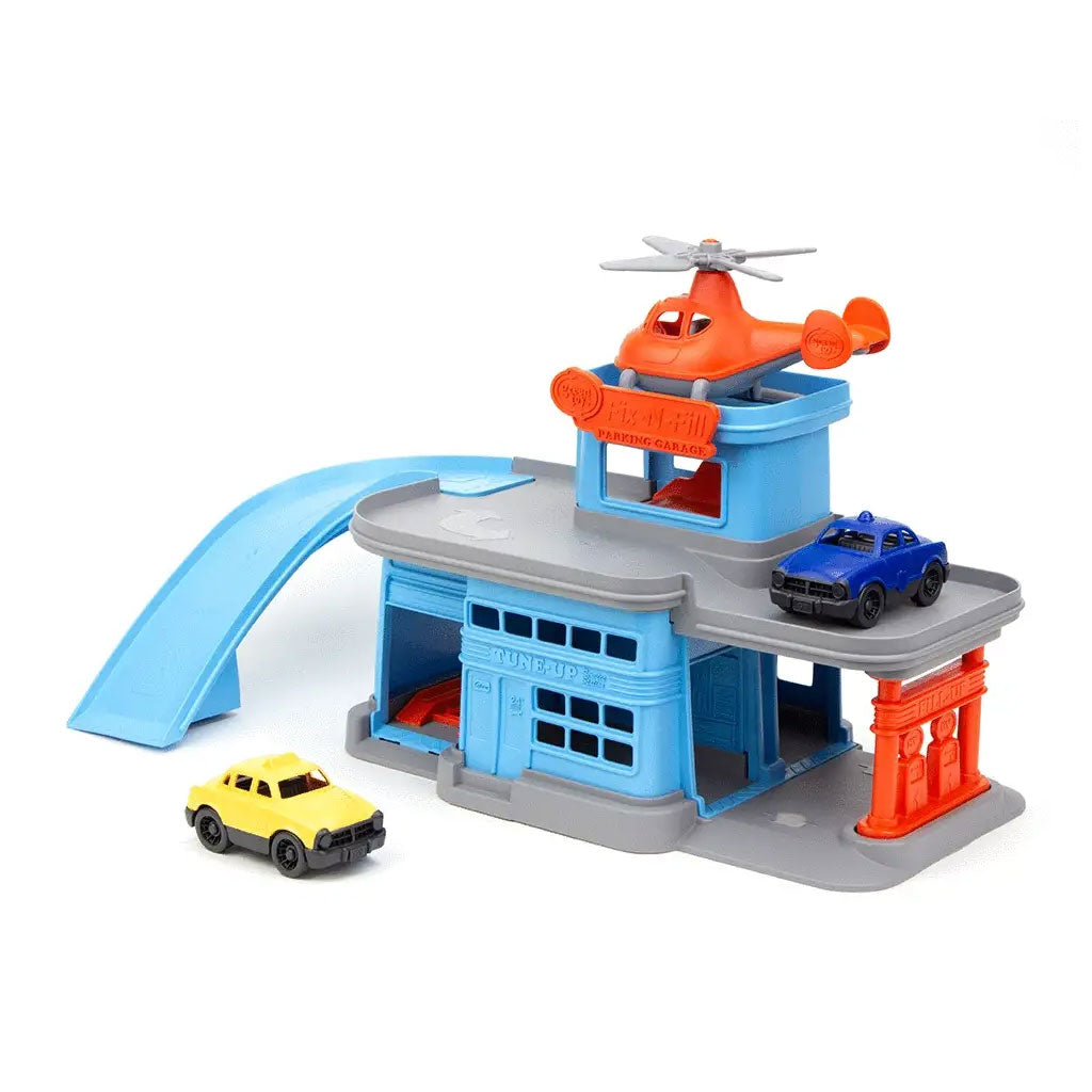 This eco-friendly garage set includes two mini vehicles and a helicopter, all made from 100% recycled plastic and built to last through endless play sessions.