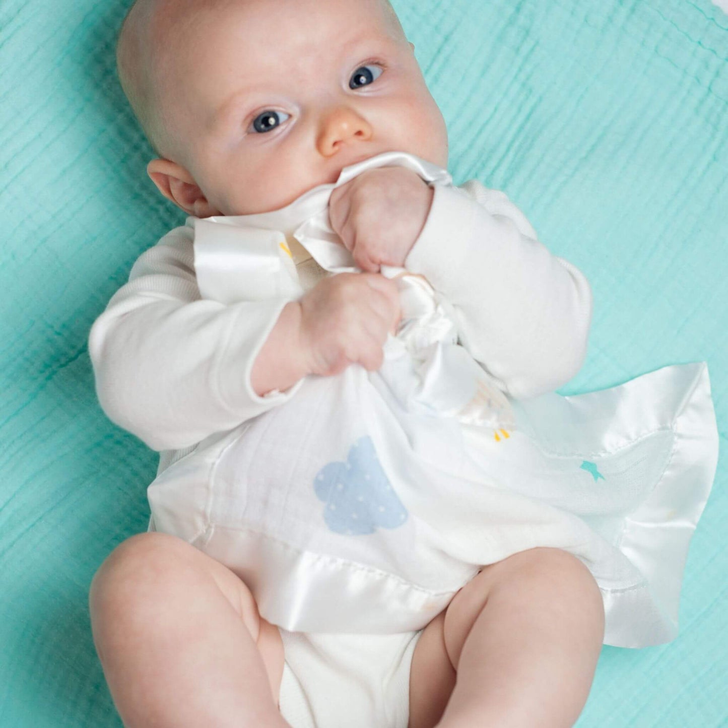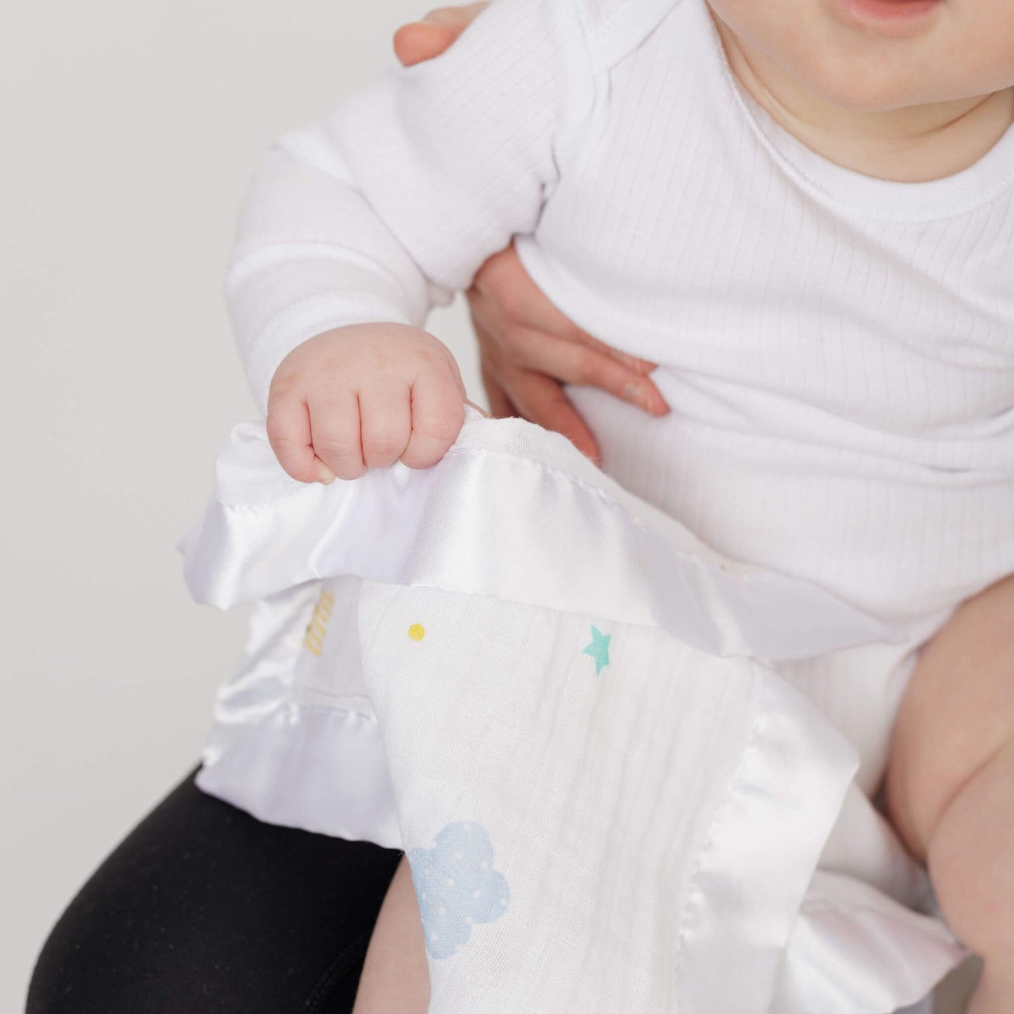 The Lulujo Security Blanket is a little comforter your baby can take anywhere. Made from soft, breathable muslin with a silky satin trim, it’s perfect for tiny hands to hold, stroke, and snuggle. Lightweight and gentle on delicate skin, it’s designed to be a soothing favourite—and it only gets softer with every wash.