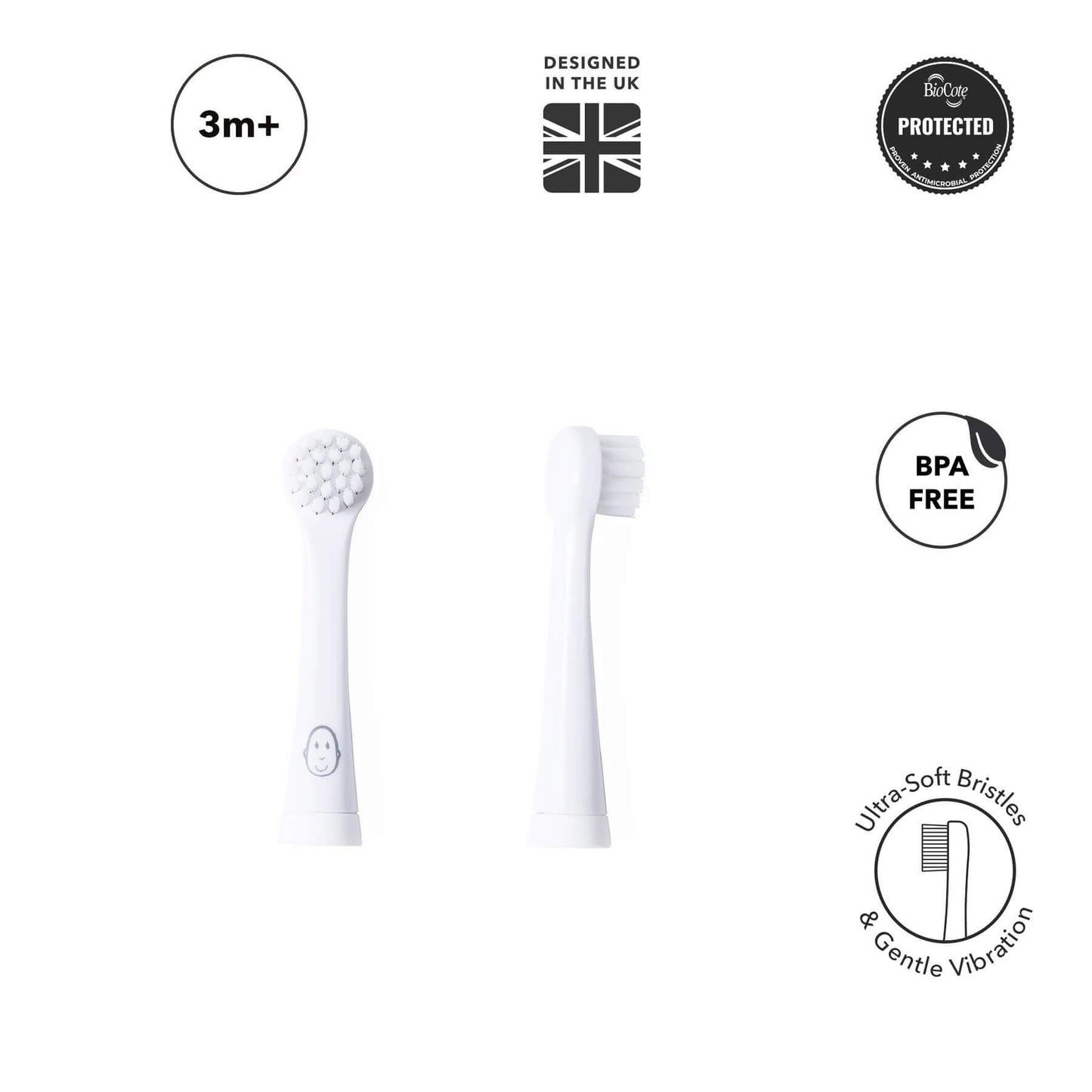 BioCote antimicrobial protection is built into the material to help keep the heads fresher between uses. It supports good hygiene without adding extra steps for parents, making these heads a simple, reliable choice for everyday brushing from 3–36 months.