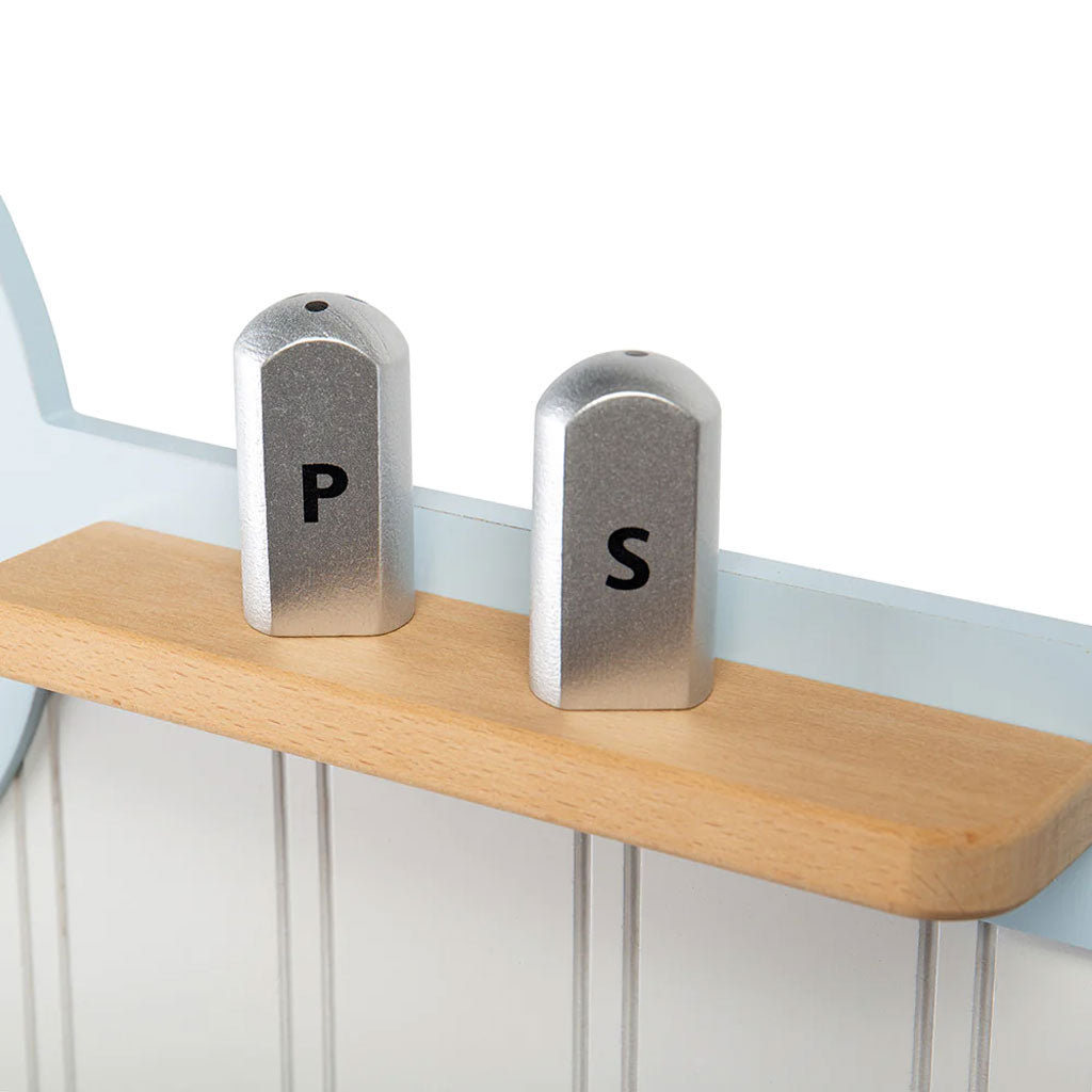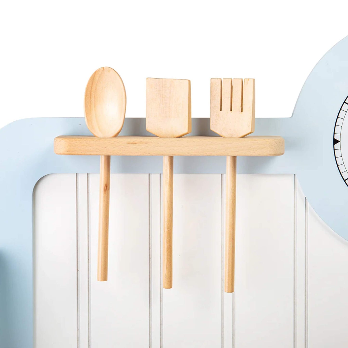 There’s plenty to explore, from the utensil shelf with three wooden tools, to the salt and pepper shakers and bottle of pretend washing-up liquid—making it feel just like a real kitchen. The clock with movable hands adds a fun way to play with time, whether it’s breakfast, lunch or dinner on the menu.