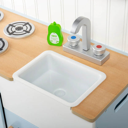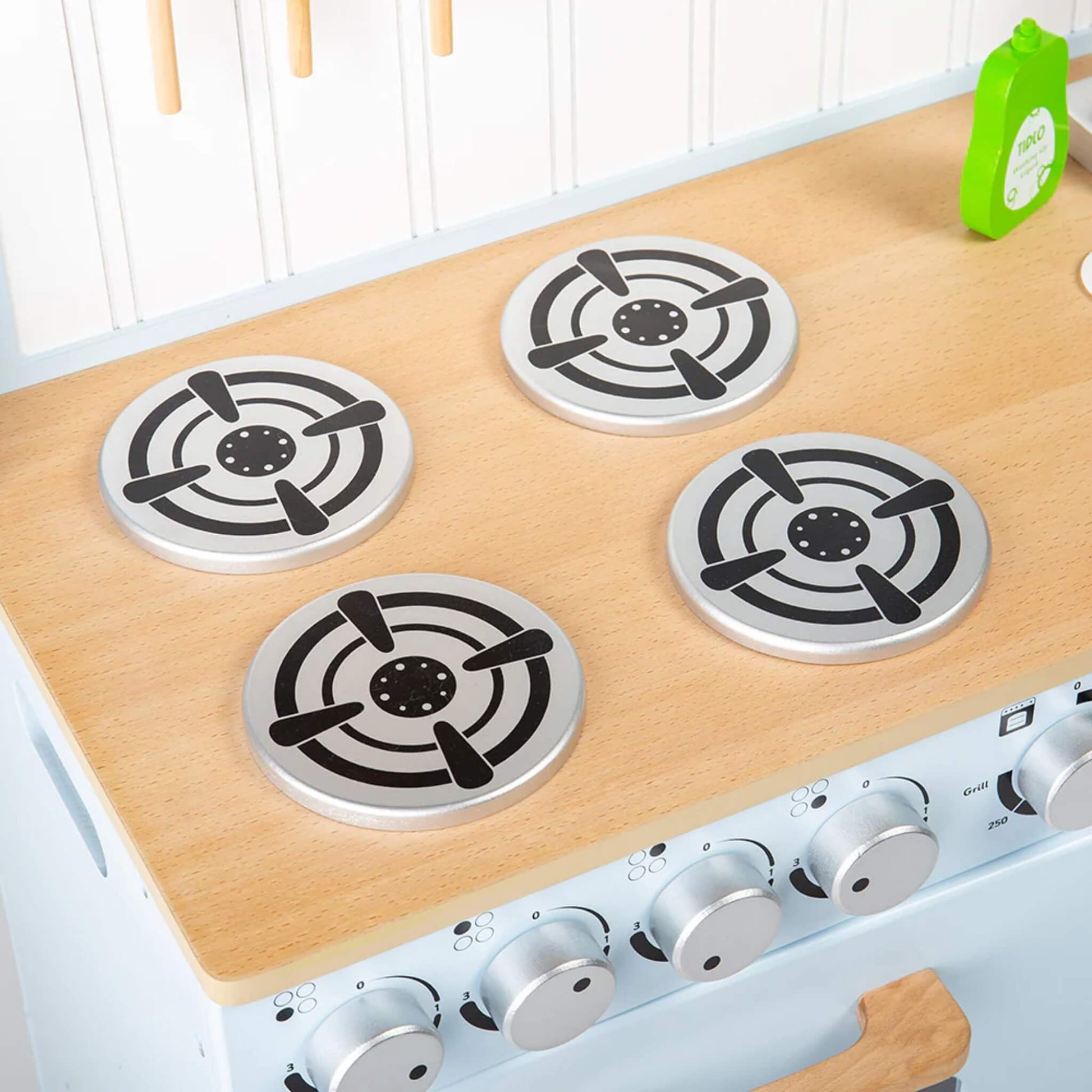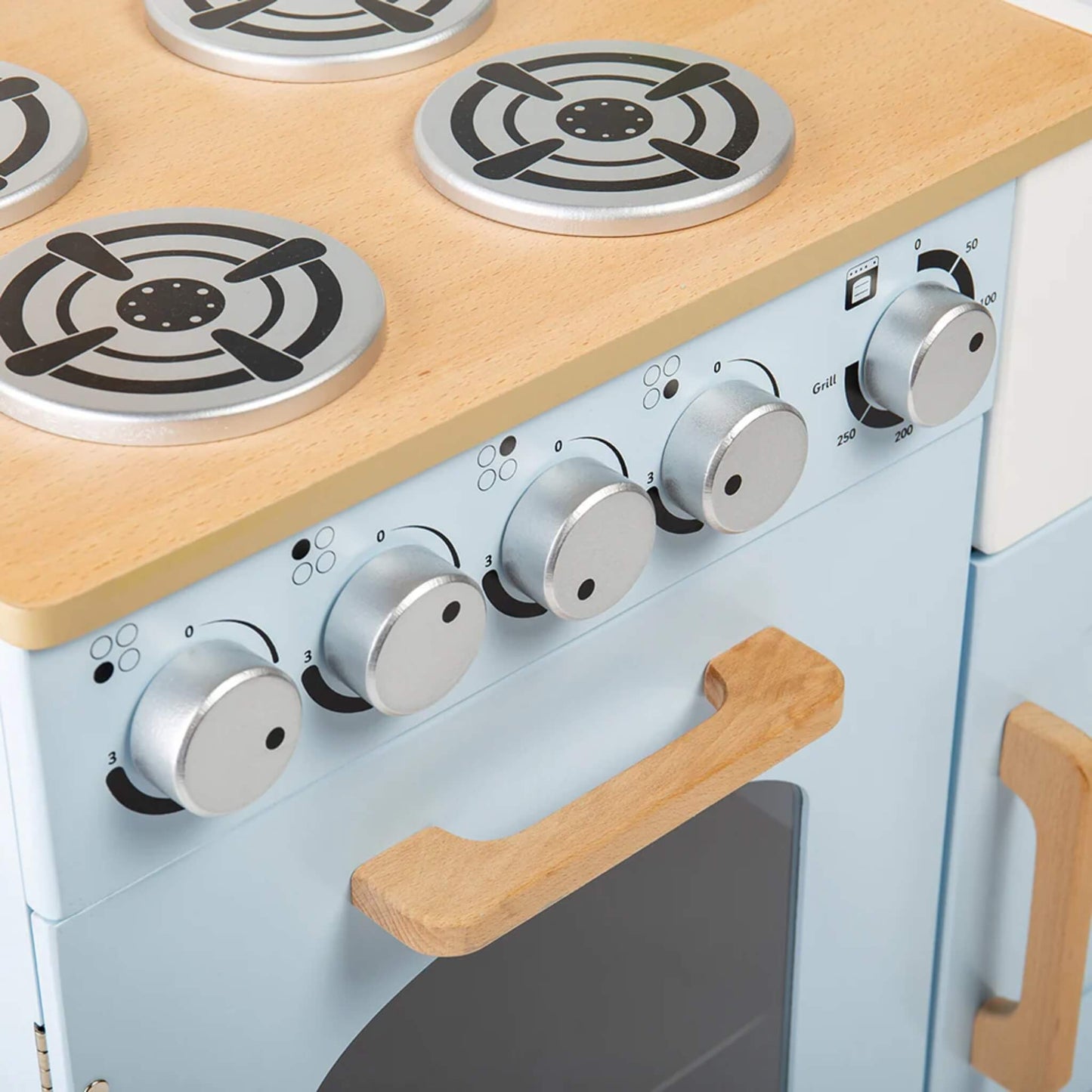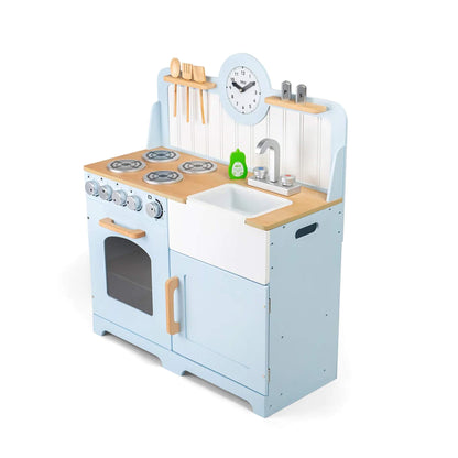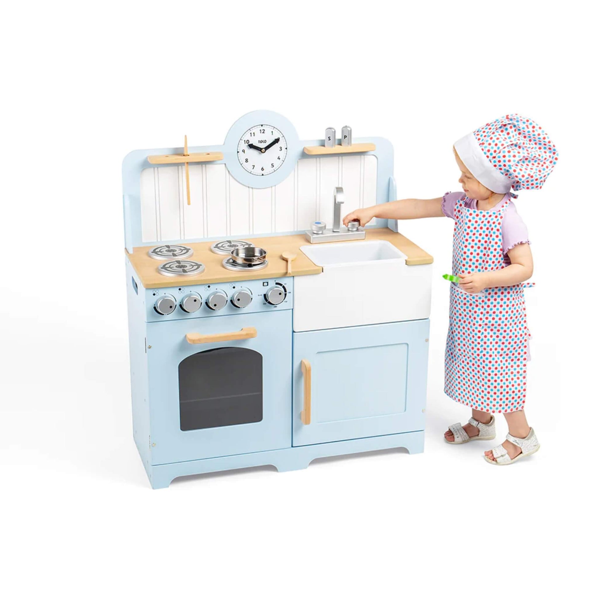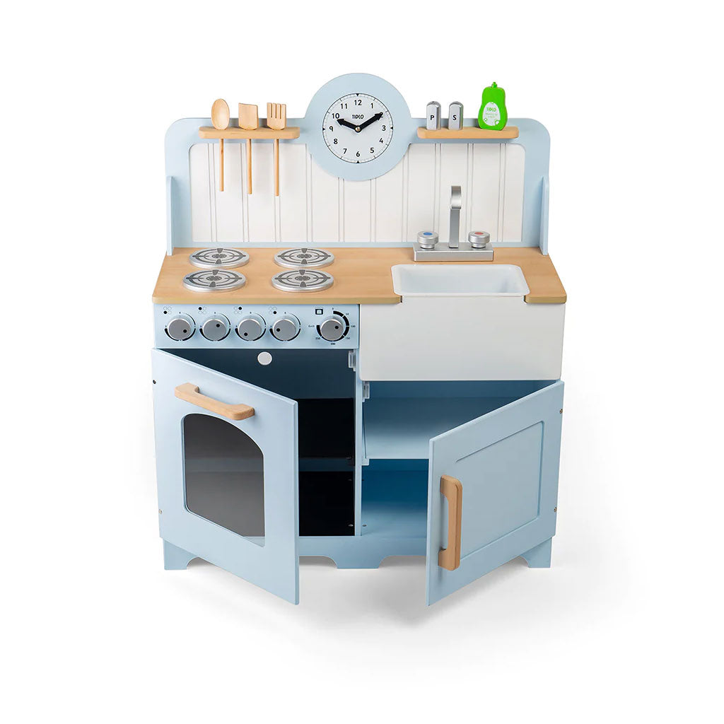 Designed with a taller worktop to grow with your child, this sturdy wooden kitchen also includes carry handles for easy moving. A lovely way to encourage early role play, promote kitchen safety, and spark conversations about healthy eating—especially when paired with play food (sold separately).