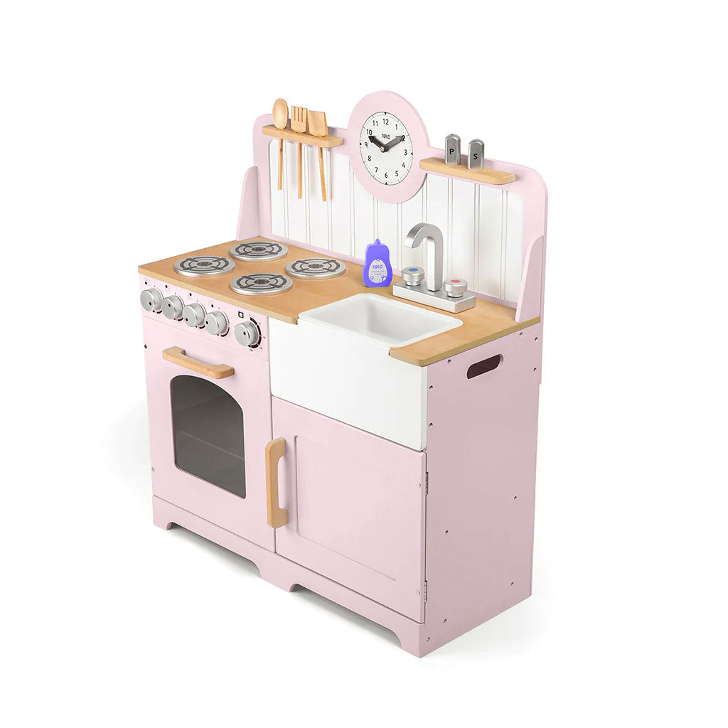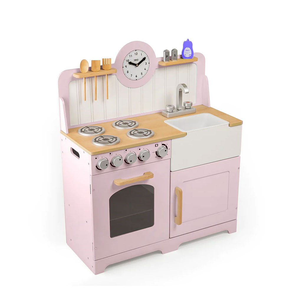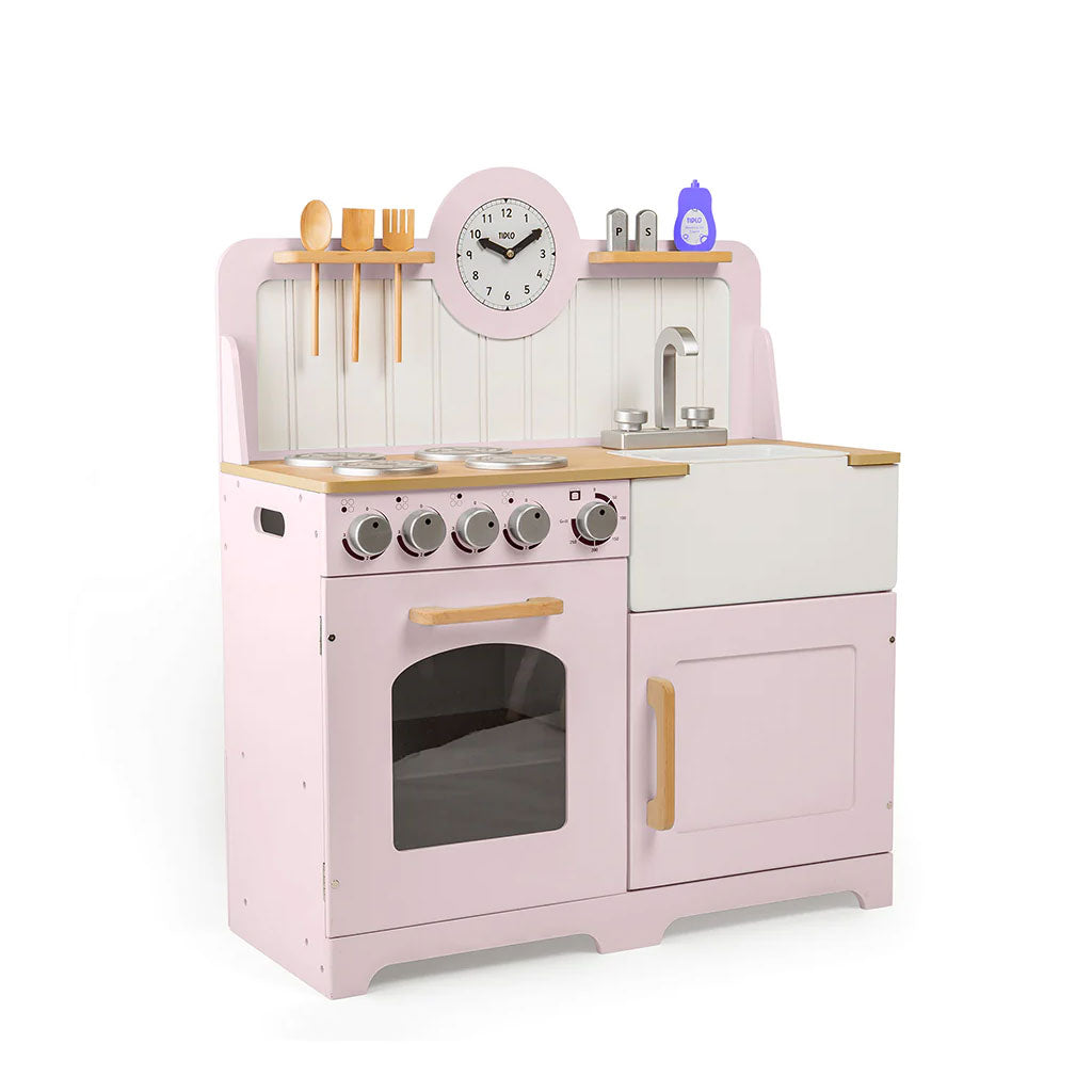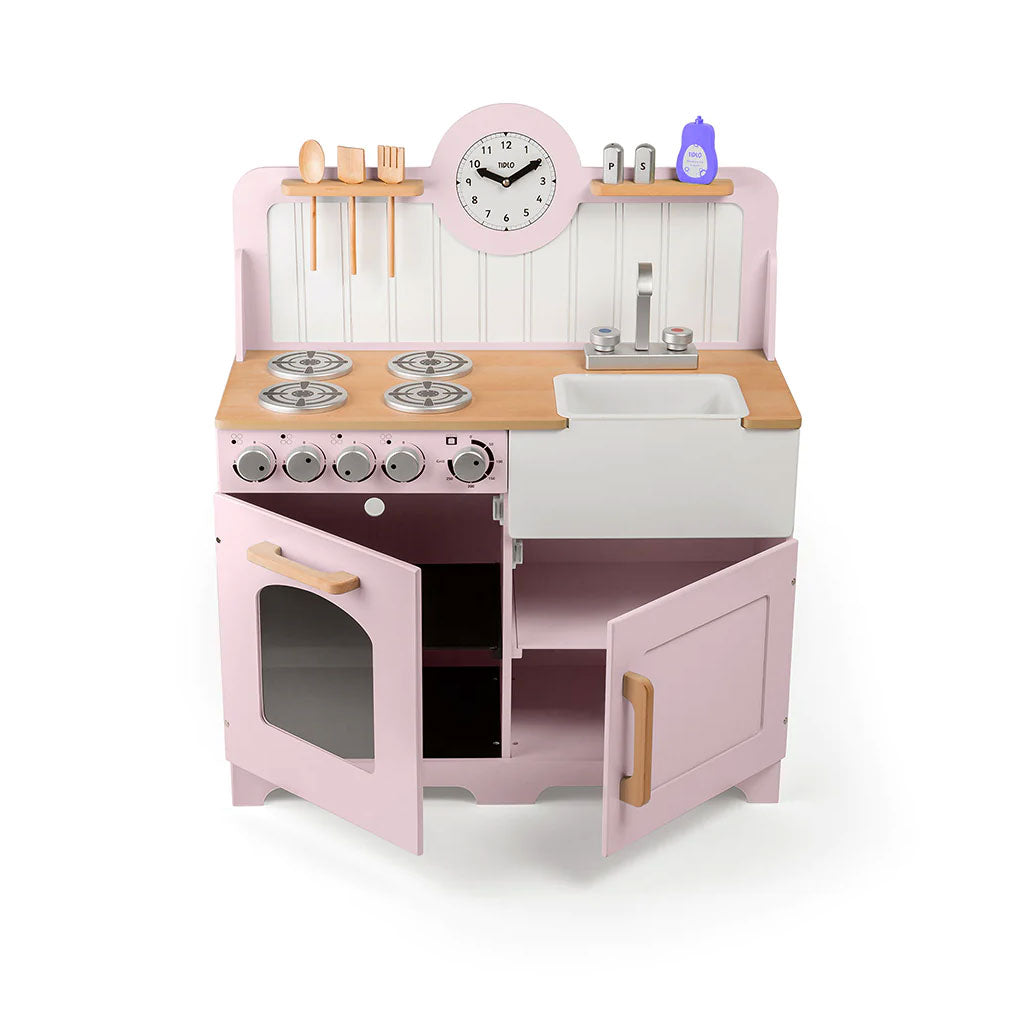 Designed with a taller worktop to grow with your child, this sturdy wooden kitchen also includes carry handles for easy moving. A lovely way to encourage early role play, promote kitchen safety, and spark conversations about healthy eating—especially when paired with play food (sold separately).