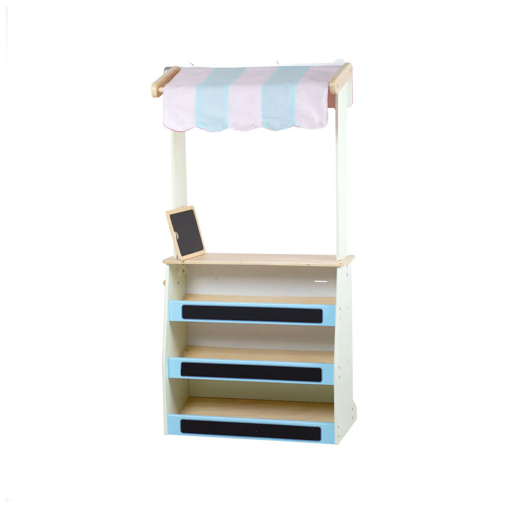 In theatre mode, children can write the next show on the chalkboard, set the time with the adjustable clock, and hand out real theatre-style tickets using the slot dispenser. Handy shelves at the back make the perfect spot for storing puppets, props or scripts between acts. Flip it around and it becomes a charming play shop, complete with a striped canopy, three angled display shelves and a wide countertop.