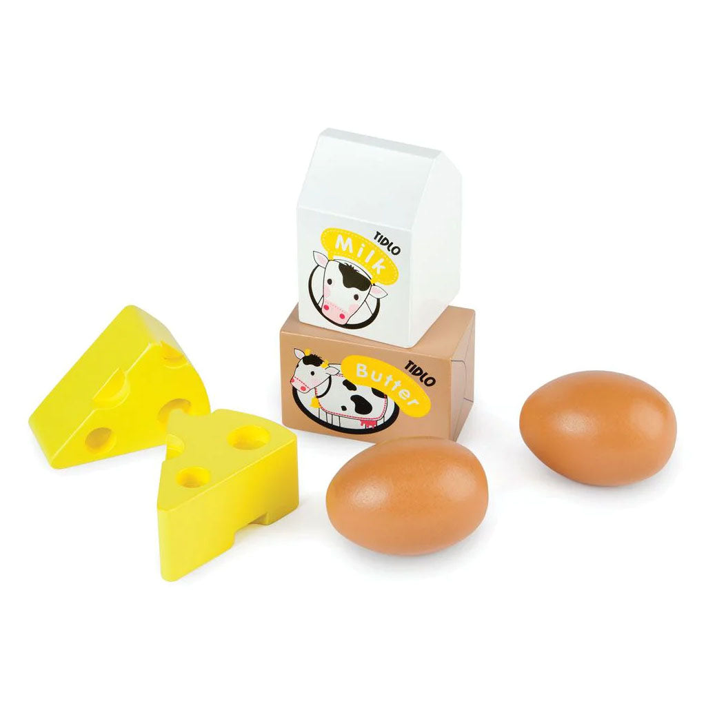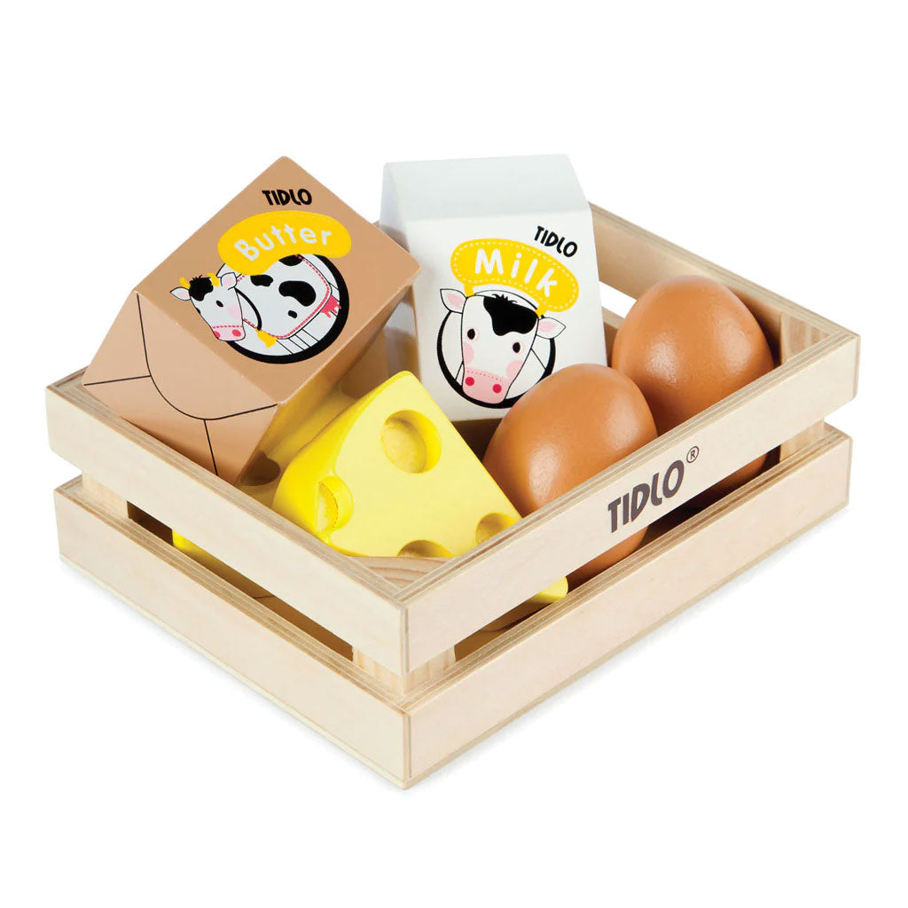 A fresh delivery is here. The Tidlo Wooden Eggs and Dairy Set is perfect for toy kitchens, café counters or playing shops. It includes a bottle of milk, a slab of butter, two cheese triangles and two chunky eggs—all packed in a wooden crate with carry handles.