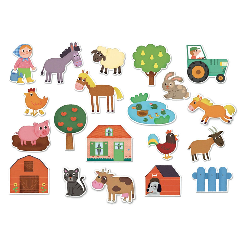 'Familiar farm animals illustrated on chunky wooden magnets, perfect for building scenes, naming creatures and sparking new stories.'